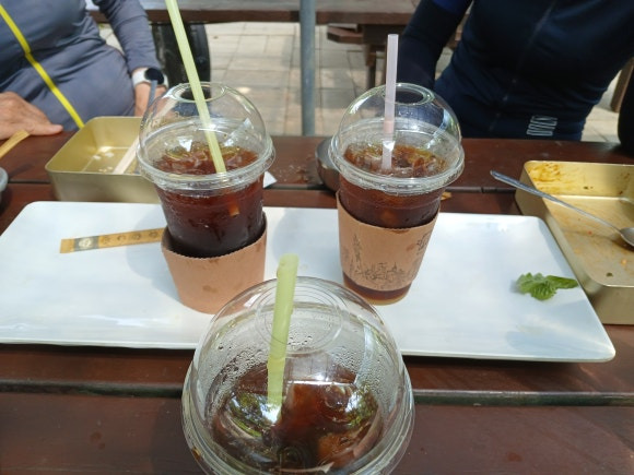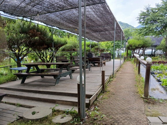 우리는 무턱대고 들어갔는데 대부분 미리 예약을 해서 온다고 한다. 식사류는 추억의 도시락뿐이다. 일명 옛날에 가지고 다니던 반합 도시락으로 일명 알본말로 '밴또'라고도 했다. 네모난 도시락에 밥과 반찬이 담겨져 나왔다. 상추쌈도 곁들여 나왔고 냉커피도 시켰다. 1인당 1만 원, 냉커피는 천 원이다. 사람들이 예약을 하고 고기 등 음식을 준비해서 와서 숯불에 바베큐도 해먹고 현지에서 재배한 채소, 그리고 자리세 비용을 내고 이곳이서 즐긴다고 한다.