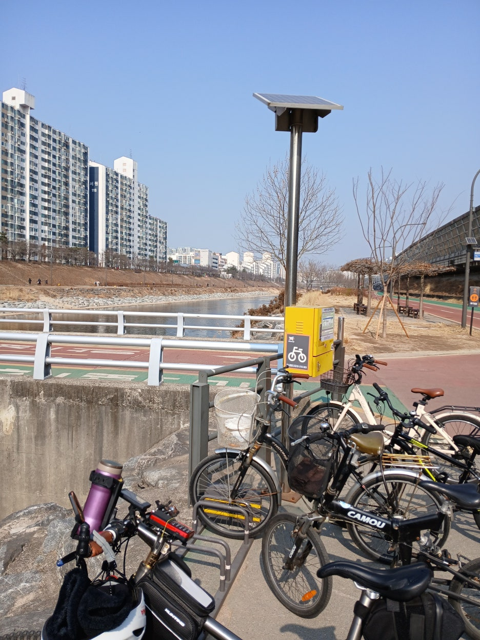 한강을 돌다가 탄천 입구 이박사한테 자전거를 정비하고 잠수교를 돌아 중량천을 타고 올라가서 중간 다리에서 중랑천을 건너 쉼터에서 쉬면서 사진도 몇 장 찍었다.