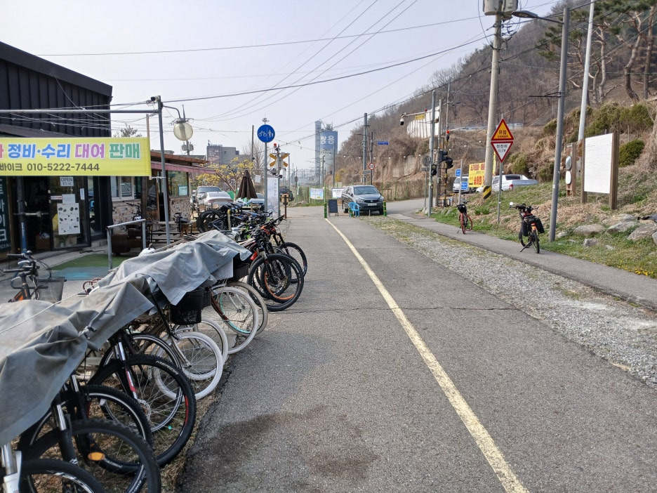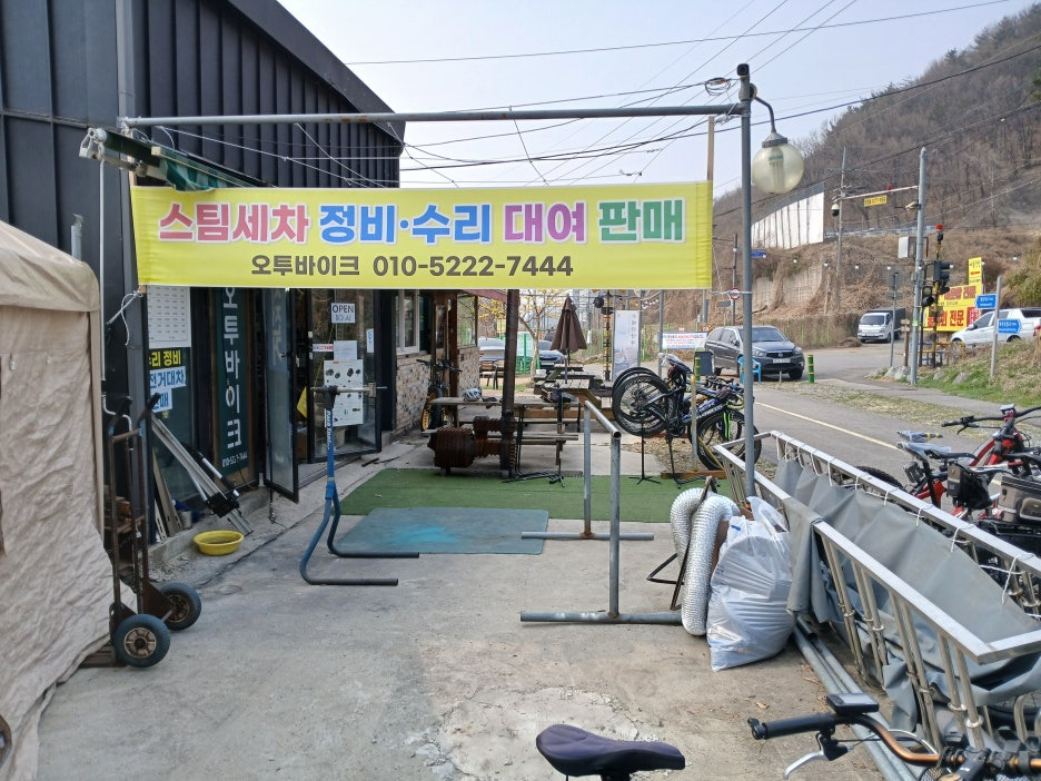우리는 알았다고 하고 다시 팔당 삼거리 방향으로 달려가다가 팔당 삼거리 음식점 윗편 '오포 자전거' 점포에 들렀다. 70대 정도 보이는 사장을 만나 모터 구리스 정비가 가능한지 물었다. 가능한데 약식 정비는 3만 원, 세부 정비는 5만 원이라 했다. 그러자 두 사람은 바로 세부 정비를 의뢰했다. 대략 2~3시간은 걸릴 전망이다.